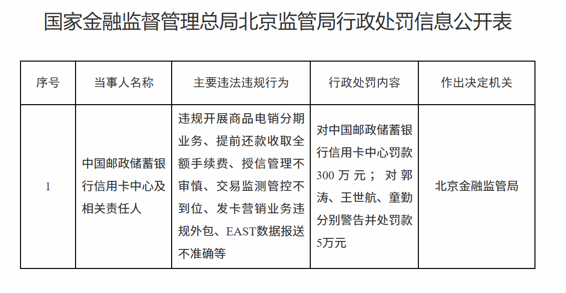 12月11日,国家金融监督管理总局北京监管局行政处罚信息公开表显示,中国邮政储蓄银行信用卡中心及相关责任人因违规开展商品电销分期业务、提前还款收取全额手续费、授信管理不审慎、交易监测管控不到位、发卡营销业务违规外包、EAST数据报送不准确等被罚款300万元;郭某、王某航、童某分别被警告并处罚款5万元。