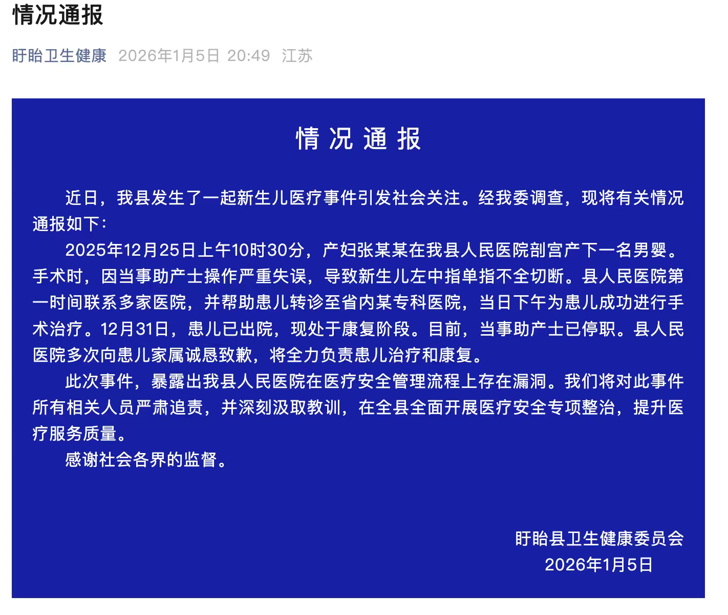 2025年12月25日上午10时30分,产妇张某某在我县人民医院剖宫产下一名男婴。手术过程中,因当事助产士操作存在严重失误,导致新生儿左手中指单指不全切断。事件发生后,盱眙县人民医院第一时间联系多家医院协调转诊事宜,协助患儿转运至省内某专科医院;当日下午,患儿在该院成功接受手术治疗。12月31日,患儿顺利出院,目前正处于康复阶段。