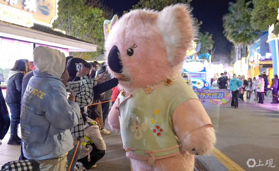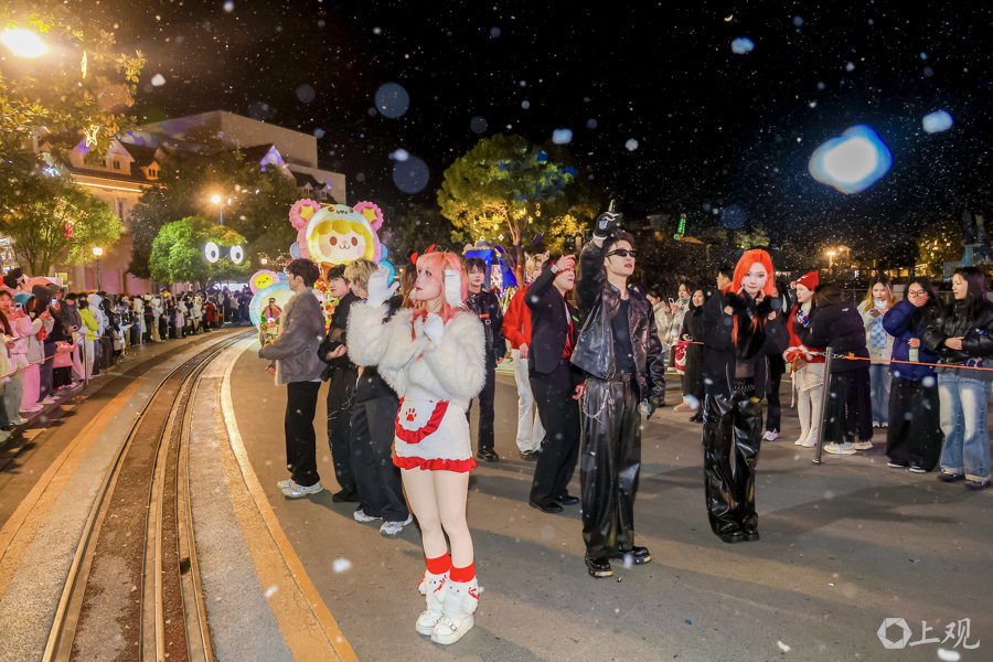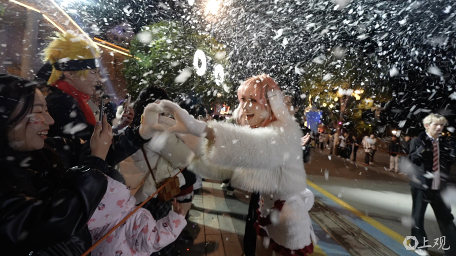 欢乐谷夜空飘起雪花,上百位Coser穿梭于乐园各大主题区域,与游客互动合影。