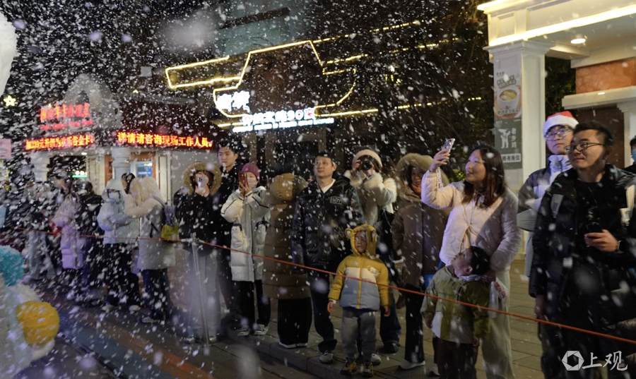 欢乐谷金矿镇开启“银装素裹”模式,每逢整点更有纷纷扬扬的雪花飘撒。