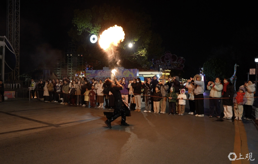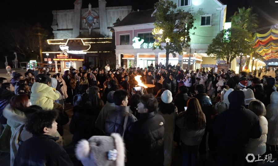 2025年12月26日晚,上海虽然尚未正式入冬,欢乐谷内却已提前飘起“瑞雪”,非遗火舞与打铁花表演交织出热烈氛围,为迎接新年营造出浓厚的节日气息。